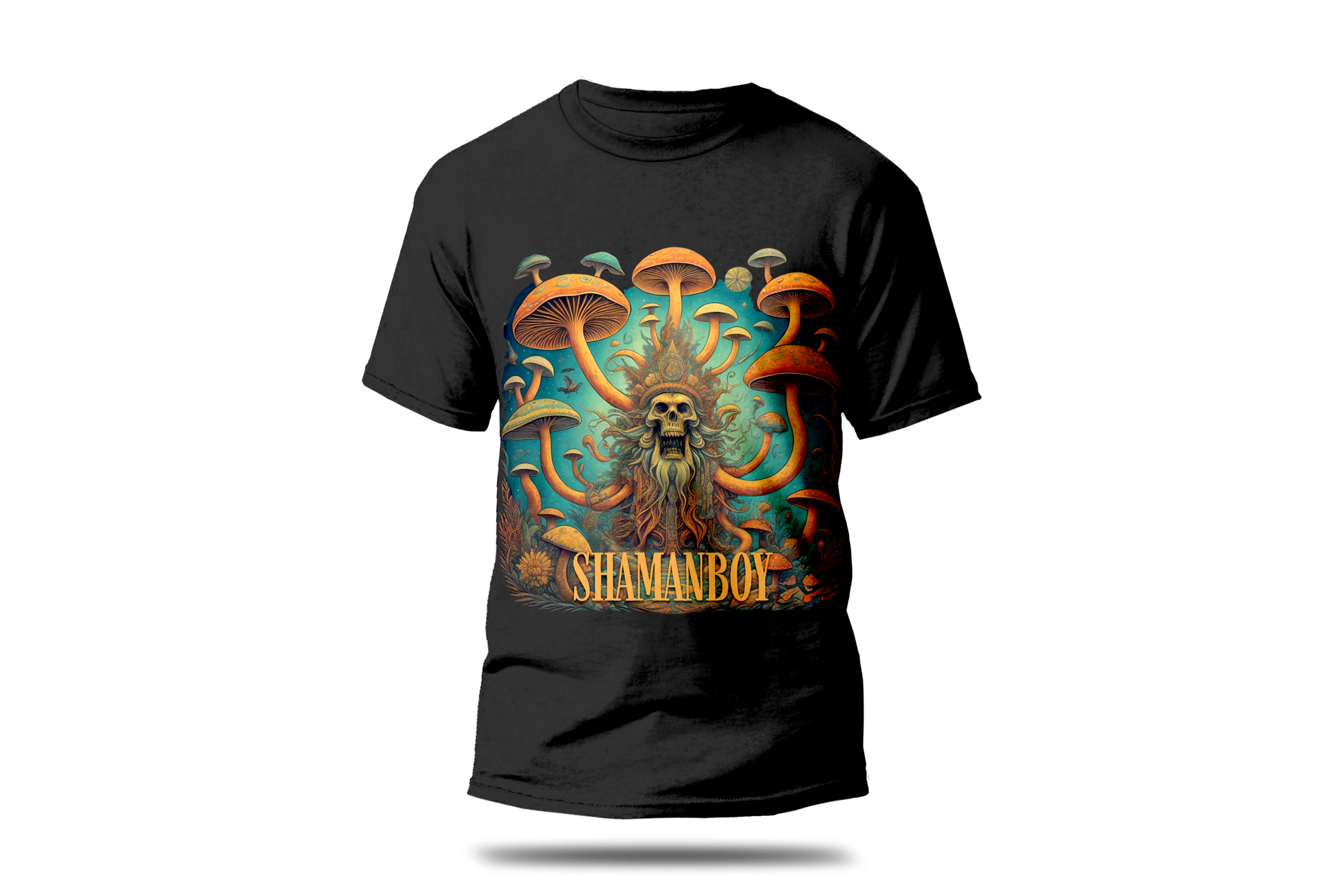 Black T-shirt featuring the vivid Shamanboy album artwork—psychedelic mushrooms, skull, and spirit design. Soft cotton, unisex fit, perfect for fans and collectors.